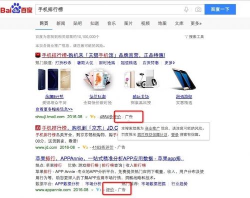 作為受影響最大的百度搜索,TechWeb查詢發(fā)現(xiàn),目前百度的搜索結(jié)果頁面的廣告樣式已經(jīng)由原來的“商業(yè)推廣”變成“廣告”二字描述了。